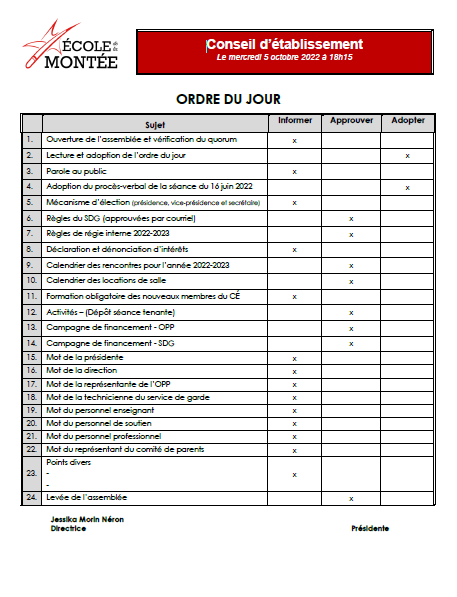 Bonjour à vous tous, voici l’ordre du jour de la rencontre du CÉ du 5 octobre prochain à 18h15. La rencontre aura lieu au local 127. Veuillez passer par la porte A.